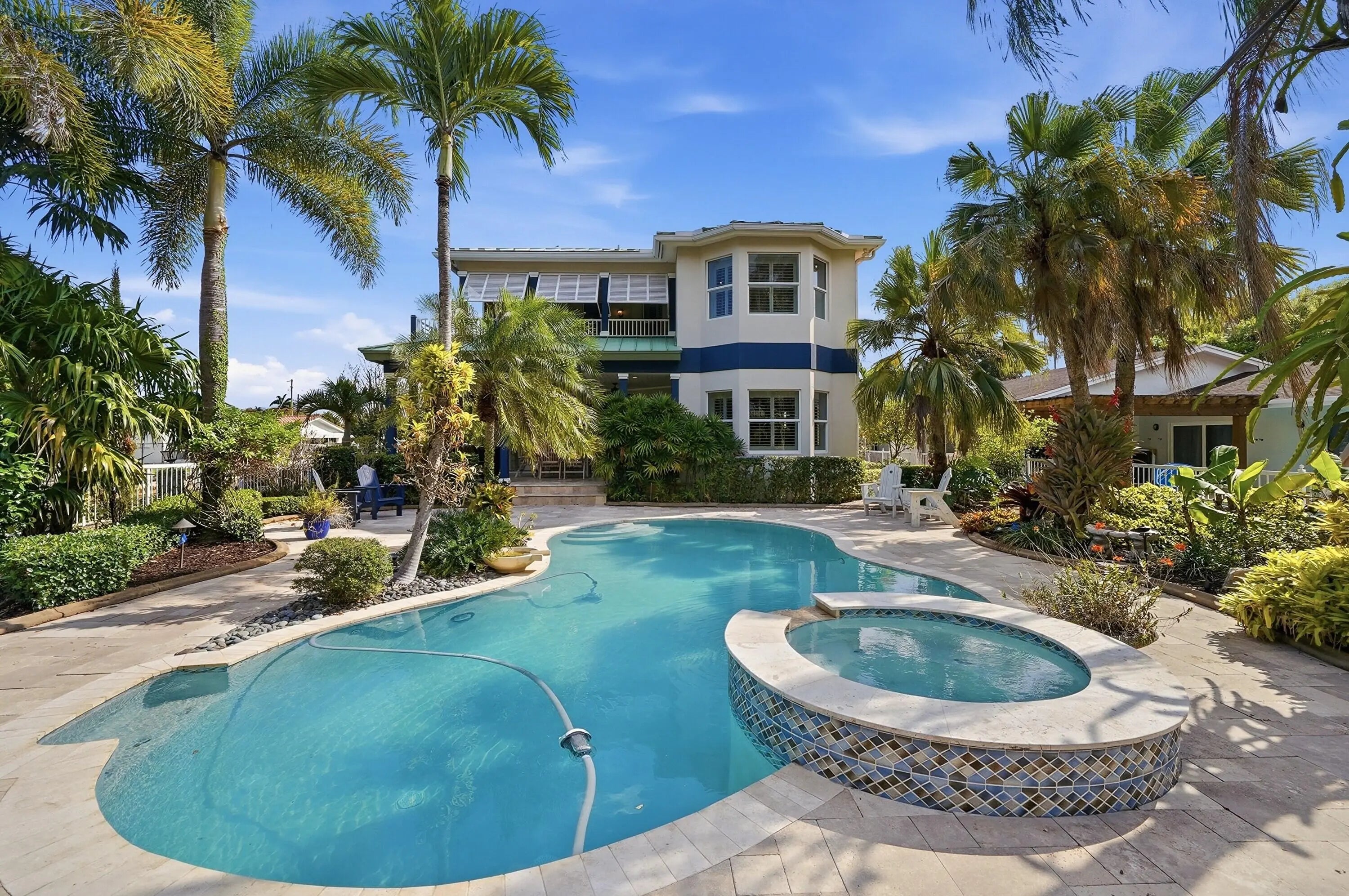 Welcome to 4412 SW 34th Ter. This custom built 3,768 sq ft, four bedroom, three bathroom, corner canal-front home is situated on a 16,709 sq ft lot with ocean access and only one fixed bridge. 100 ft dock with full concrete seawall and lowered dock section is perfect for boaters. Aluminum roof and hurricane impact windows and doors for piece of mind. Open kitchen that features a Sub Zero refrigerator, Miele espresso maker, Wolf cooktop and a reverse osmosis water system. Multi zoned air conditioning with separate thermostats for upstair and downstairs. Experience comfortability with the in-ground propane tank powering a recently upgraded whole-home generator that is plumbed into your outdoor grill. Your backyard oasis includes a heated pool, hot tub and a cabana bath for gatherings. Downstairs features three separate rooms currently used as an office, a dedicated gym/fitness room, and a media/TV room. The media room includes a closet and offers flexibility for use as a potential fourth bedroom. Available fully furnished.