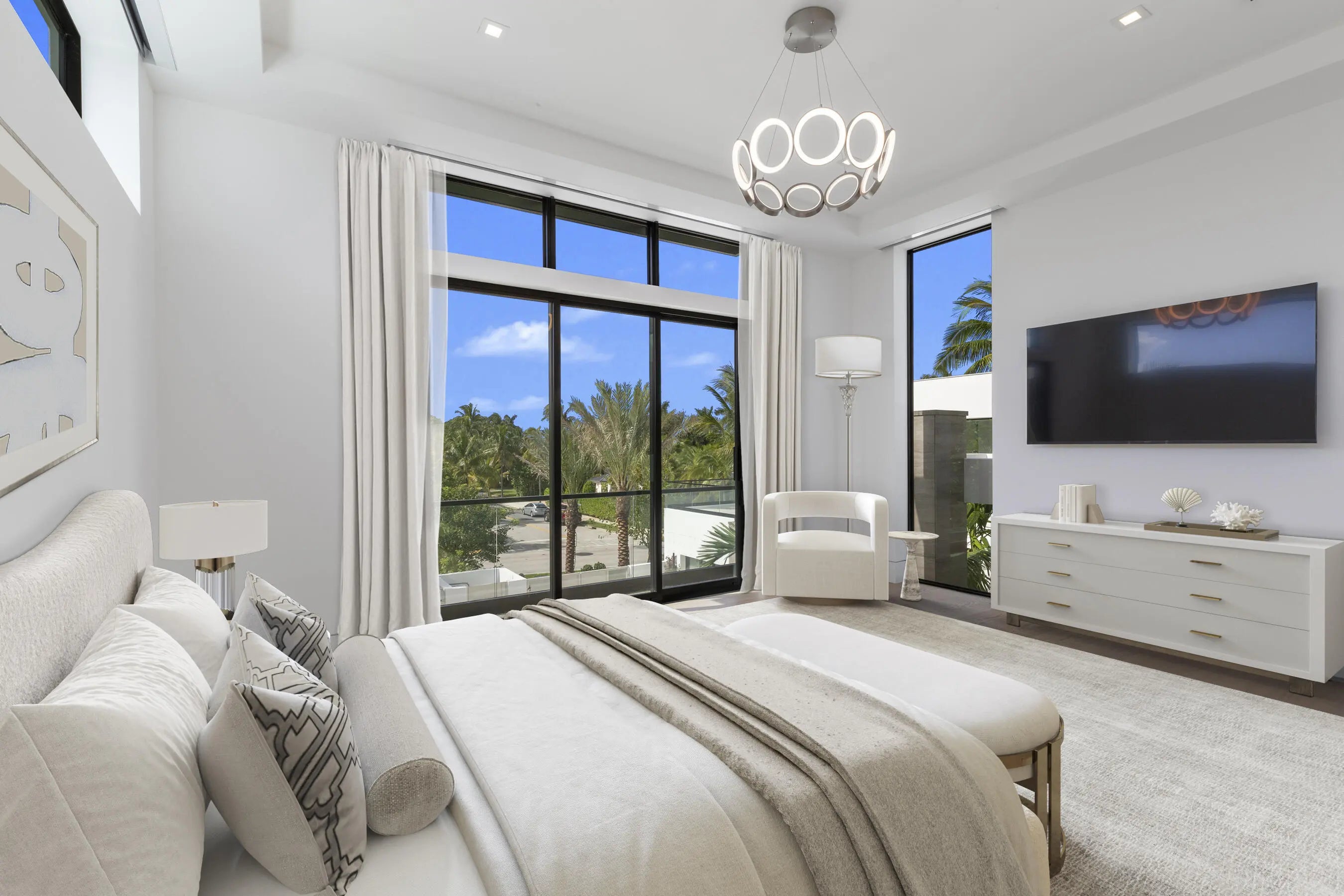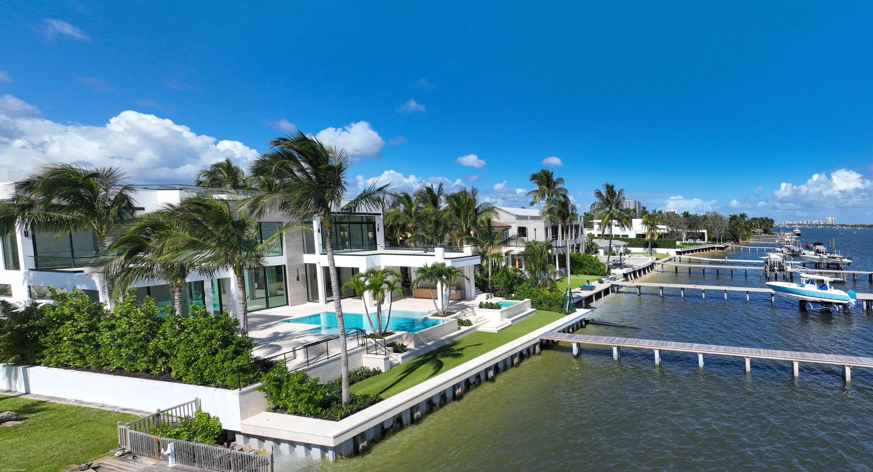 Spectacular new modern waterfront estate on the Intracoastal in West Palm Beach. Designed by architect David Lawrence, this 2024-built residence offers 12,730 total SF with 8,540 SF under air, featuring 7 bedrooms, 8 full baths, 2 half baths, elevator, 40' saltwater pool, spa, rooftop decks, fire pits, and summer kitchen. Elevated 10' above sea level on a 20,000 SF lot with 80' of direct waterfront, dock with 50k lb lift, no fixed bridges, and ocean access. Chef's kitchen, multiple living areas, media room, sauna, and in-law suite. Impact glass, 150KW whole-house generator, 3-car garage, and security system. No HOA. Minutes to beaches, Palm Beach Island, The Square, and PBI. A true Intracoastal showpiece.
