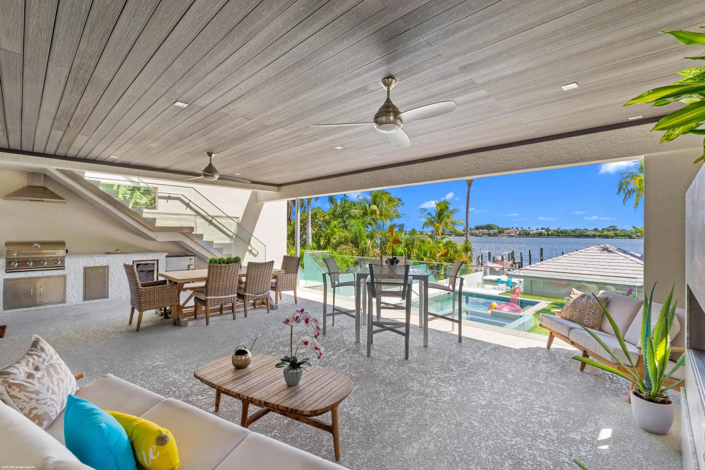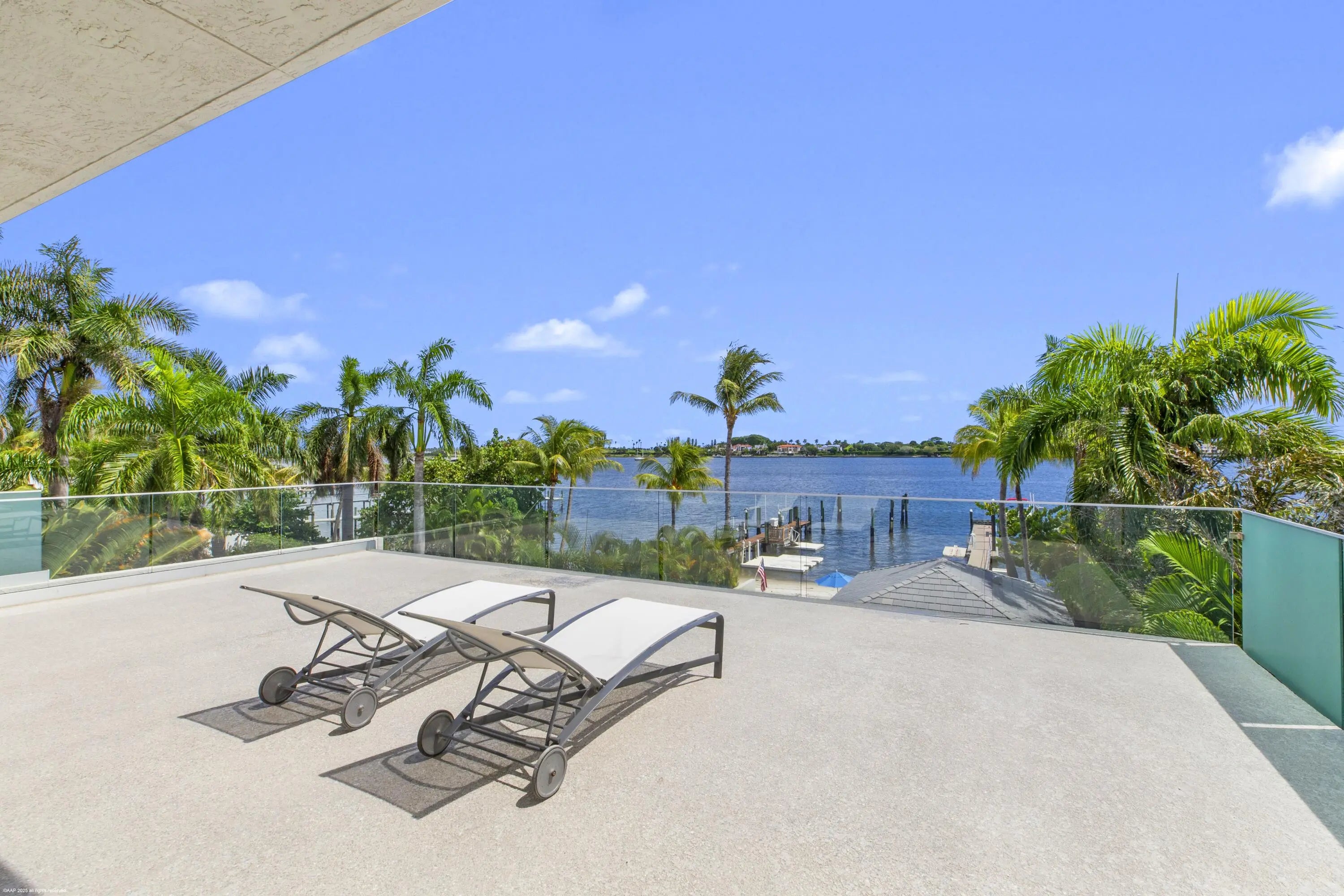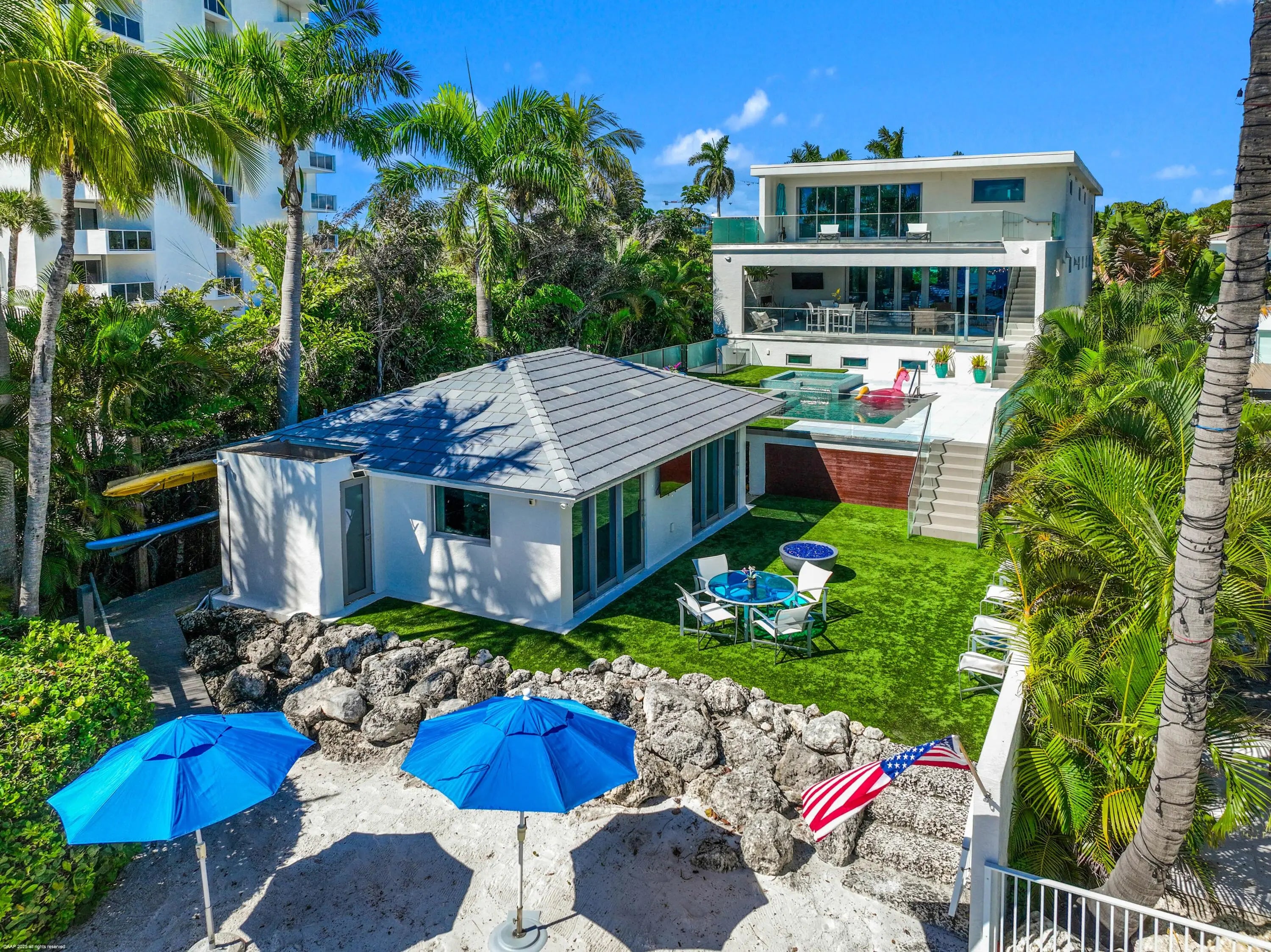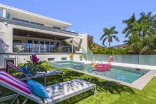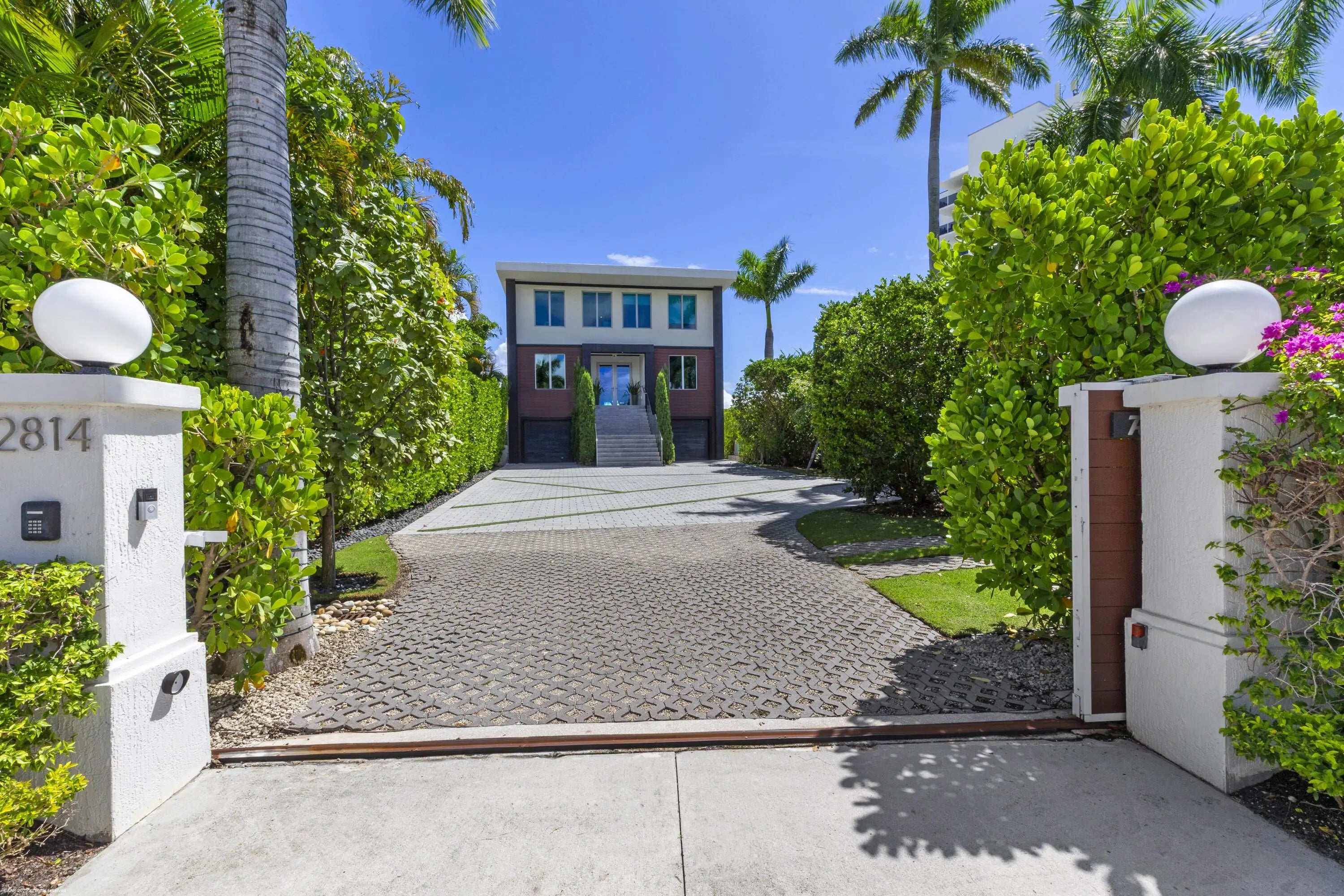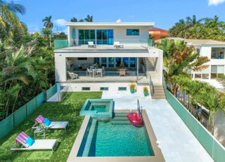 This stunning new direct Intracoastal Oasis was inspired by the incredibly talented minimalist architect Ludwig Mies who was the pioneer of modern architecture. The home's main level has the gourmet kitchen, the living, family and dining rooms all in one open space boasting beautiful views of the wide Intracoastal waterway and Palm Beach. Take the elevator to the third floor where the primary suite has a large deck overlooking the resort style back yard/pool/spa and beachfront. This third level has two additional bedrooms with en-suite baths and great closets. The VIP bedroom and club room are located on the ground floor and live like a separate home. Down at the beach sits a lovely private cabana giving guests the best seat in the house! Behind the entry gates, the air conditioned garage