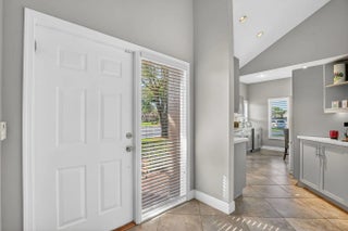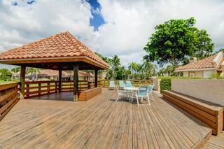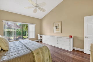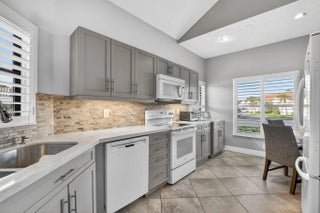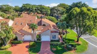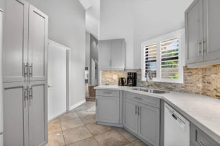 End-unit villa in desirable Meridiana at Boca Pointe featuring 2 bedrooms plus a den or optional 3rd bedroom. High ceilings enhance the open feel, complemented by an enclosed sunroom for added living space. The kitchen has been updated with quartz countertops, gray cabinetry, and white appliances. Both bathrooms have been tastefully remodeled. Laminate flooring runs throughout the main living areas, den, and master bedroom, with tile in the kitchen and carpet in the second bedroom. Enjoy a private backyard with patio and impact-glass patio door. Additional features include plantation shutters, replaced washer and dryer, water heater (2018), A/C (2016), and a redone garage floor with built-in cabinets included. Community amenities include a pool and small clubhouse.