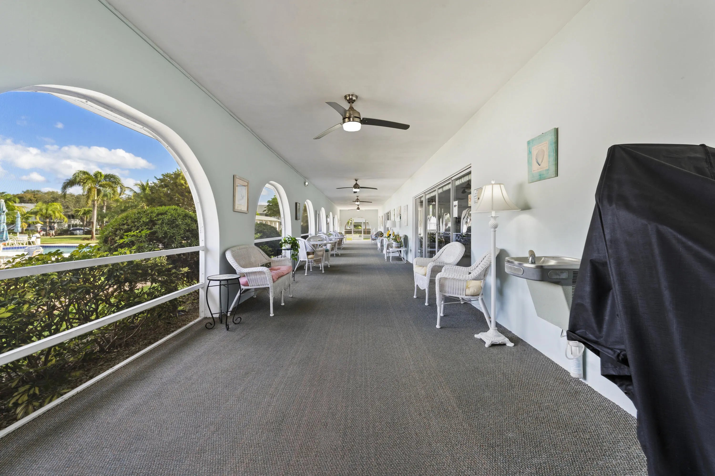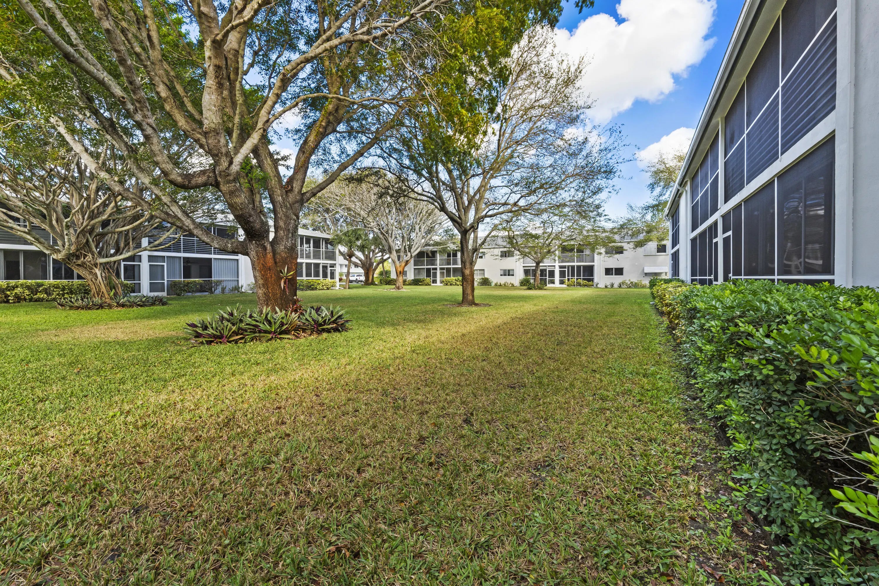 Well-maintained 2-bedroom, 2-bath first-floor condo located in a desirable 55+ community with a peaceful garden view. Features include ceramic tile throughout, four ceiling fans, crown molding in the living and dining areas, and plantation shutters for a classic touch. Enjoy a glass-enclosed patio room or open up for a fully screened room perfect for relaxing year-round. Recent upgrades include a new upgraded electrical panel, newer roof . Impact Windows and Accordion Shutters for added peace of mind .Community amenities offer two pools, shuffleboard, a putting green, clubhouse, library, and grill area. Laundry and storage room next door. Ideally situated within walking distance to excellent restaurants, shopping, and more. A wonderful opportunity for comfortable, low-maintenance living