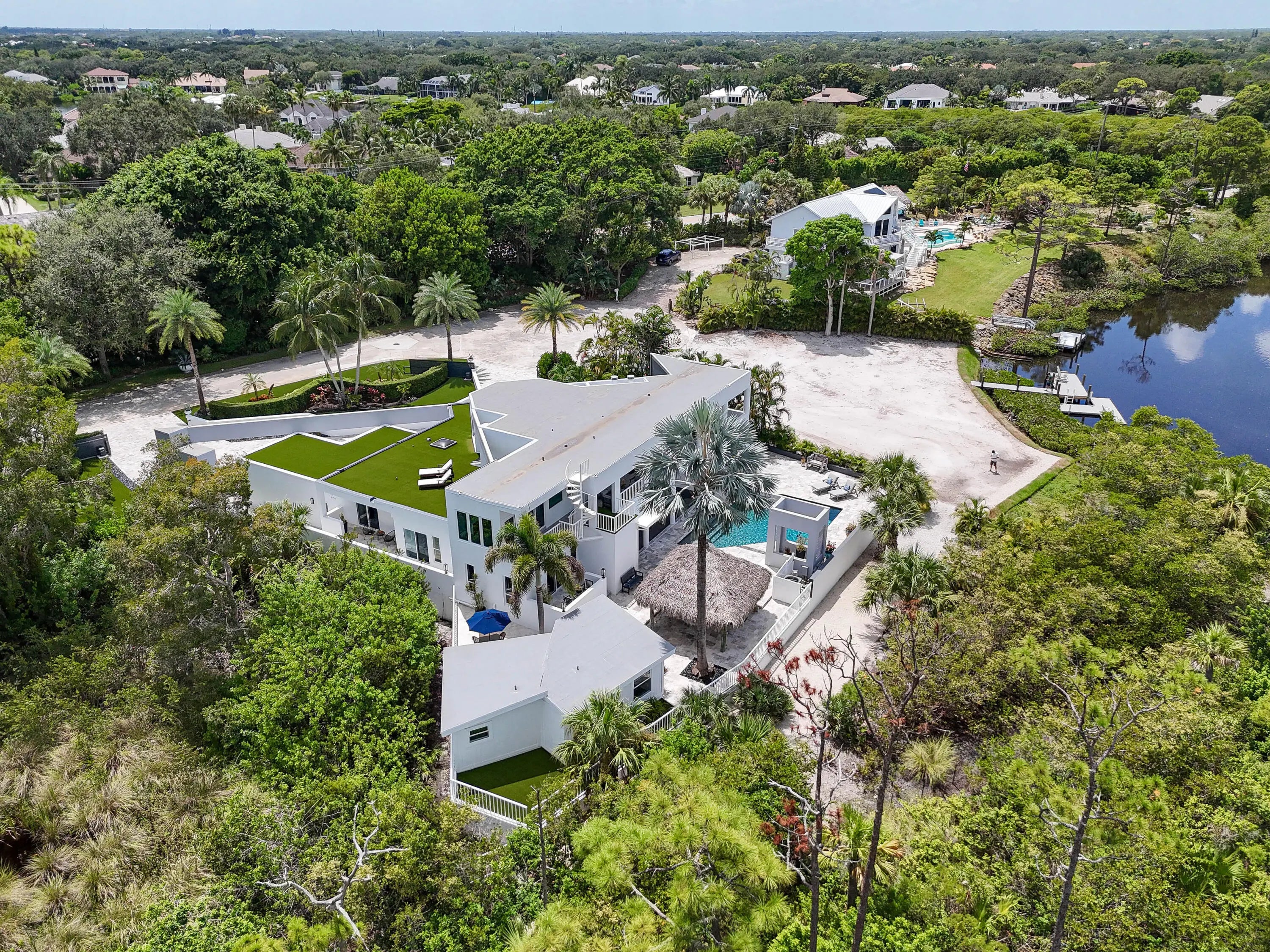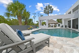 Impeccable Newly Renovated CBS Home, Property, and Guest House with River access for water sports. High and dry property surrounded by concrete walls. First floor elevation sits over 11 feet above sea level. Located minutes to the Beach and town center. This Stunning Home & Property offers a Large Captivating Heated Salt Water Pool, Built-In Cedar Sauna, Turf Rooftop Decks & Lawn, Expansive Silver Travertine Driveway & Pool Deck with Hardscaping, plus a Private Gated Entry. Epic Views of the Loxahatchee River & Jonathon Dickinson State Park with sunset views. 5 Bedrooms, 5 Bathrooms of Airy Living Space with Abundant Natural Light. Large private property with Hiking/Biking Trails from your back door access. Awe-Inspiring Second Level Primary Bedroom Suite with an Office and outside shaded